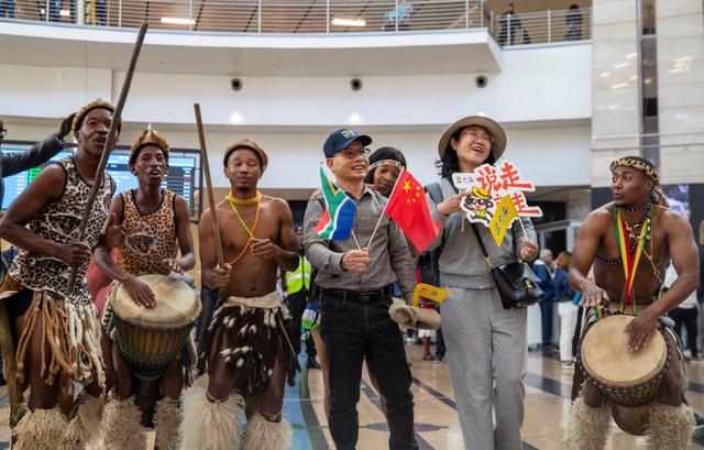 在南非约翰内斯堡坦博国际机场,南非舞蹈演员欢迎中国试点恢复出境团队旅游后首批抵达南非的中国游客(2023年3月29日摄)。