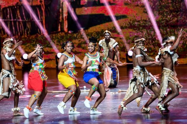 来自南非的演员在中国内蒙古呼和浩特市举行的第十一届中国国际民间艺术节上表演《祖鲁歌舞》(2019年8月23日摄)。