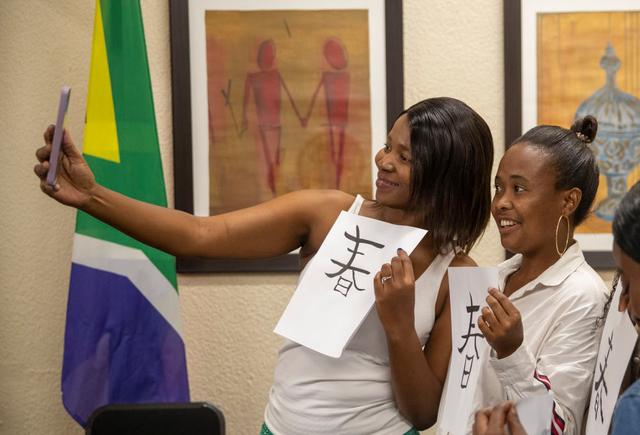 南非德班理工大学孔子学院师生举着“中南友好”书法作品(2023年8月18日摄)。